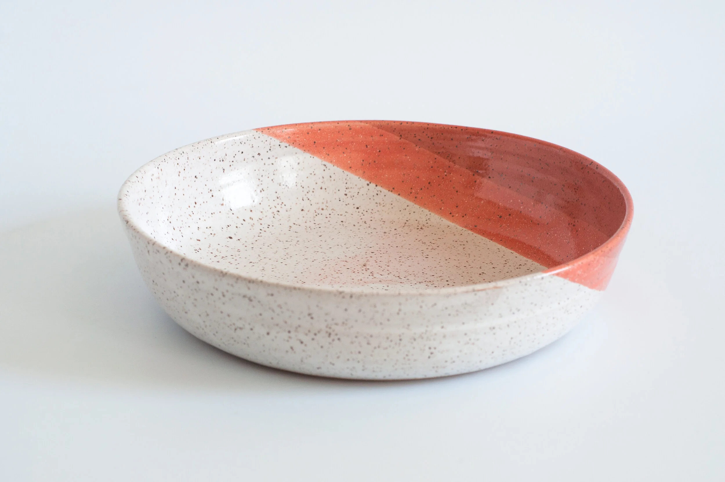 Sara and Jonah have chosen a variety of bowls to compete their dinnerware set. They have chosen custom glazing with Coral, Light Blue, Dark Blue, and Sage on speckled white.